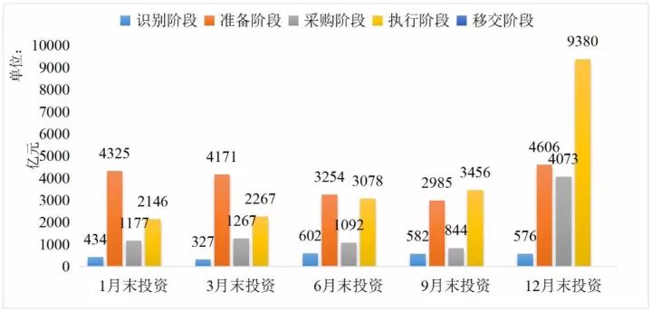 (二)各階段項目數(shù)量和投資額有較大的變化。PPP項目按全生命周期分為識別、準(zhǔn)備、采購、執(zhí)行和移交5個階段。按項目階段來講,2016年三批示范項目數(shù)量和投資總額情況如圖1-1和圖1-2。由于第三批國家示范項目在10月份公布,12月末的數(shù)量和投資額比前二批項目有大幅度的增加。整體來看,到2016年末,處于識別階段的項目及投資額減少,而處于執(zhí)行結(jié)段的項目及投資額都有大幅度提升。從整體上看,目前入庫項目大多數(shù)處于識別階段。